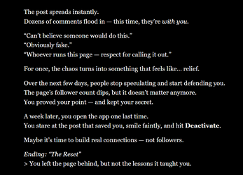Hook: You run an anonymous class gossip account, balancing truth, lies, and anonymity to stay popular without getting caught.